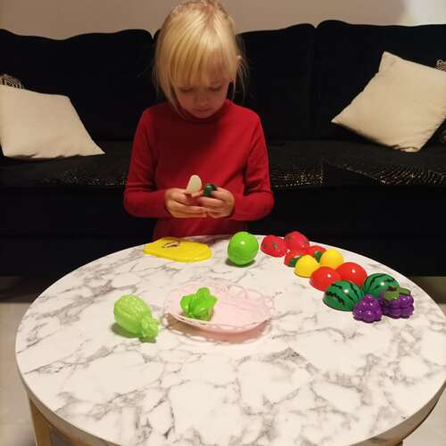 CUTTING VEGETABLES AND FRUITS + BOARD AND KNIFE IN A BASKET COLLECTION OF COLORFUL FRUITS AND VEGETABLES – a set of precisely reproduced vegetables and fruits in a basket will allow for interesting play at home, in the shop or in cooking. Vivid and juicy colors will attract the child's attention and encourage them to play . POSSIBILITY OF CUTTING AND RECONNECTING – thanks to the included knife and board as well as internal Velcro you can cut items in half and then put them back together, which definitely adds variety to the fun. AFFECTS THE CHILD'S DEVELOPMENT - the toy not only allows for an interesting and joyful time , but also affects the child's intellectual development and the growth of their motor skills. It develops imagination and stimulates creativity , as well as teaches teamwork and improves social and integration skills; it is useful not only in recognizing the names and shapes of vegetables, but also in learning colors and counting. BASKET INCLUDED – the set includes a basket, which allows the child to easily carry fruit and vegetables to any place. SPECIFICATION – material: plastic; connection: velcro; can be cut: yes; number of elements in the set: 23; dimensions: 16 x 12 x 3.5 cm; set weight: 0.175 kg; weight with packaging: 0.387 kg.