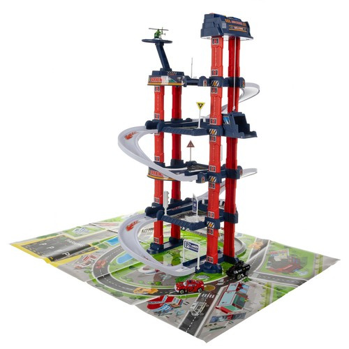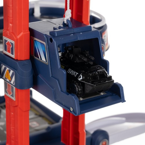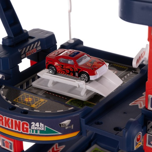 PARKING / GARAGE 4 LEVELS HIGH QUALITY AND DURABILITY OF MATERIALS - The toy garage has 4 levels, made of solid and durable PP and ABS materials, which ensures longevity and safety of use. Every element, from the parking lot on each level to the track and safety barriers, has been carefully designed to withstand intense play . Additionally, the set includes PS elements, such as the cars and helicopter, which are also high-quality and resistant to damage. Thanks to this, the garage is perfect for kids who love dynamic play toy cars and building your own cities. FUNCTIONAL AND MODERN DESIGN - at the top of the garage there is a helicopter landing pad , which adds realism to the game and enriches the play scenarios. Each level of the garage is secured with barriers that protect cars from falling out, and are suitably placed road signs allow you to create your own traffic rules. A perfectly contoured track with barriers , leading from the very top, allows for a smooth descent of the cars , guaranteeing an exciting ride. In addition, raised channel at the highest level, it is a great addition, allowing for creative solutions and additional fun possibilities. INTERACTIVE ELEVATOR WITH LIGHT AND SOUND EFFECTS - the garage is equipped with an interactive elevator that can be mounted on the right or left side of the garage . The lift can accommodate one car and you can use it control using two colored buttons . The red button lowers the elevator , and pressing it again stops it at the appropriate level. The yellow button raises the elevator. During operation extract you can hear the signaling sounds and Blue lights at the top of the elevator flash , adding interactivity and realism. Blue button reproduces the signals of emergency vehicles and road vehicles, while green imitates the sounds of a horn and heavy equipment. Each sound causes the lights at the top of the elevator to flash , which introduces an element of dynamics and engages children in the fun. ADD-ONS THAT ENHANCE YOUR FUN - the set includes a board made of high-quality ABS, showing the city infrastructure , on which you should place a garage and place road signs. Board adds realism and expands the possibilities of play , allowing you to build your own routes and scenarios. The set includes two cars - a racing car and a combat vehicle - and helicopter which are made of durable PS and ABS materials . Road signs set allows for the creation of a personalized and safe traffic infrastructure. Each the parking level can be Additionally stick the included stickers to set road signs and markings , which means that children can fully adjust the appearance of the garage to their needs and preferences. GARAGE SPECIFICATION - color: multicolor; material: PP, ABS, polyester, PS; dimensions: 38 x 40 x 67 cm; weight: 1.5 kg; weight in packaging: 2 kg.